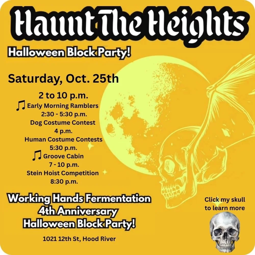 The weekend’s biggest blowout, Haunt the Heights, takes over Pine Street in Hood River with a full day of live music, food vendors, cider and wine, a bounce house, and both pet and human costume contests. Local favorites Early Morning Ramblers and Groove Cabin headline before an after-party featuring Supernova at The Underground.
