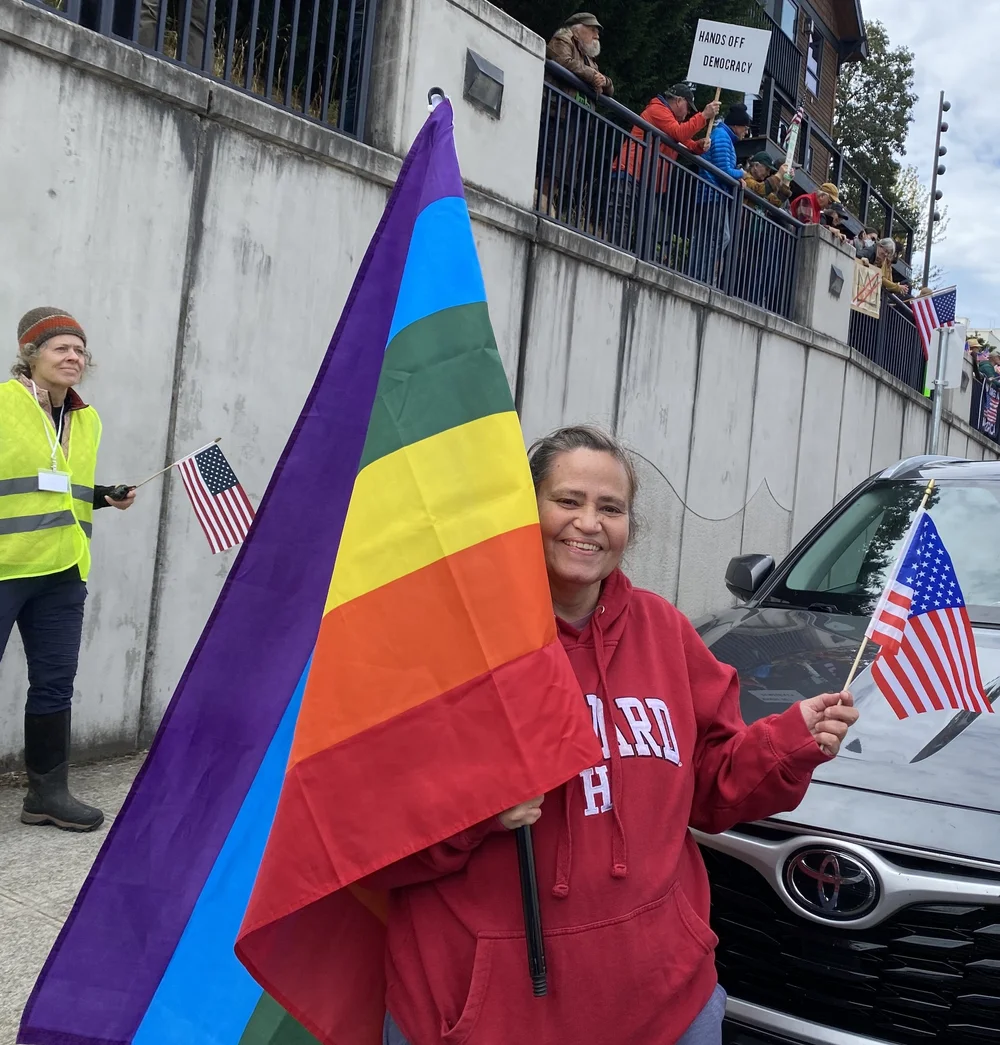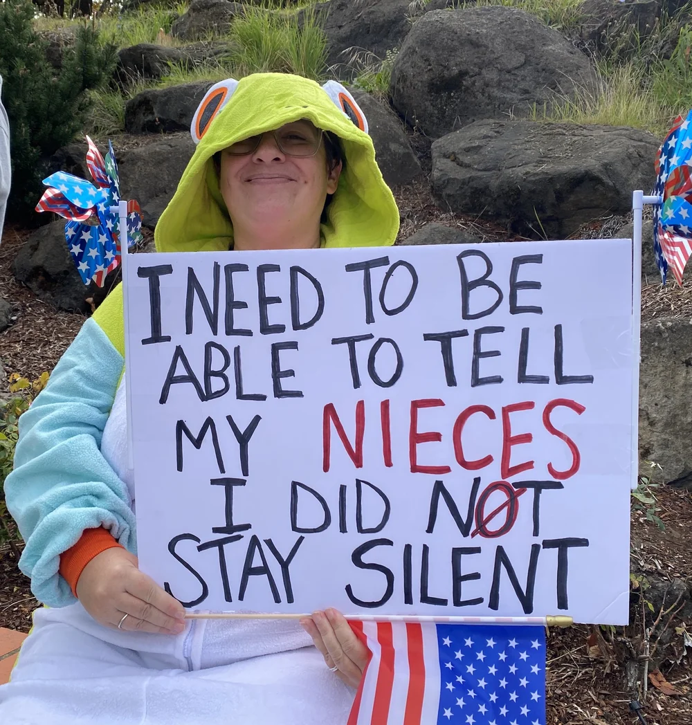 June Hansen came to Oregon for a half-marathon but found herself standing in solidarity at the Hood River rally. “Trump seems to think that he’s, like, the end all be all,” she said. “He’s got the last word on everything, and that shouldn’t be. This is a democracy. This isn’t a king.” Hansen said she was there “to protect the rights of people coming up after me,” especially those often targeted. “Transgender, Latinos — I mean everybody,” she said. “That’s why I’m here.”